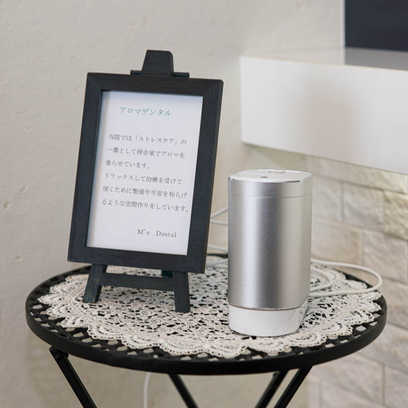 当院では、院内待合室と治療室にアロマディフューザーによるミストでエッセンシャルオイルの自然な香りとうるおいをお届けしています。